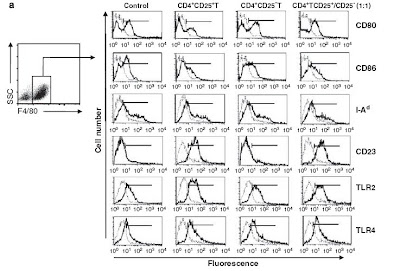 2. A segunda sugestão envolve a ação de células T regulatórias sobre macrófagos. Os autores demonstram in vivo que o contato com Tregs altera o fenótipo de macrófagos para M2. Dentre os resultados mais significativos, animais que receberam a transferência de células T CD4+CD25+ apresentaram macrófagos peritoneais com capacidade reduzida de apresentação de antígenos e produção de óxido nítrico, associado com o aumento de expressão de IL-10 e arginase. O estudo é de autoria de Liu et al. e está no prelo no períodico Immunology and Cell Biology.