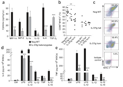 1. Em um trabalho muito elegante a ser publicado na Nature Immunology, o grupo do Prof. Charles Dinarello descreve os papéis e mecanismos de ação da citocina IL-1F7, membro da família IL-1. Os autores provêem uma vasta gama de experimentos que demonstram sua expressão, capacidade em suprimir a produção de citocinas pró-inflamatórias, desativação de células dendríticas e indução de um prognóstico favorável em modelo experimental de choque séptico. Com base nos resultados apresentados, os autores sugerem que a citocina seja denominada de IL-37;